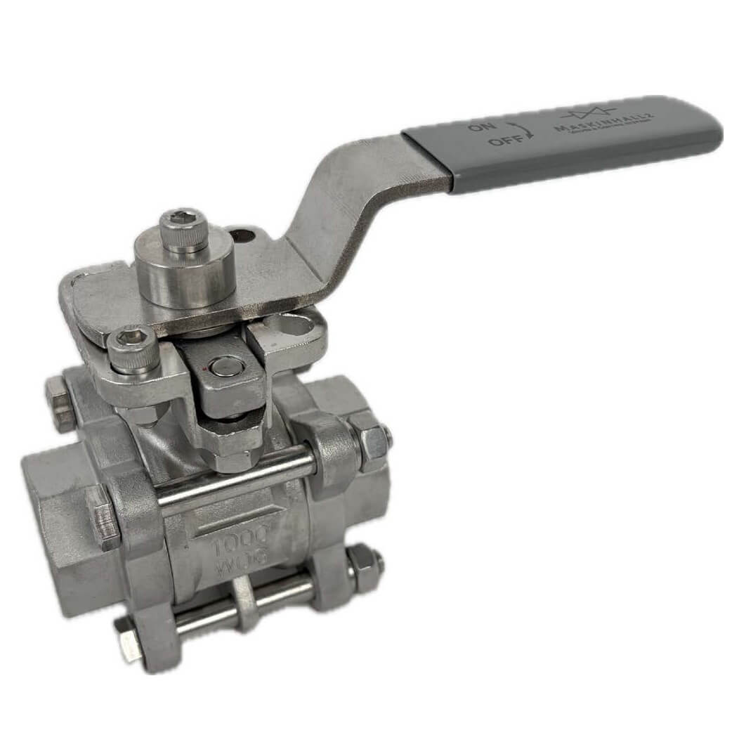Three-piece, full bore, ball valve in stainless steel and PTFE seat, ISO top, threaded ends.