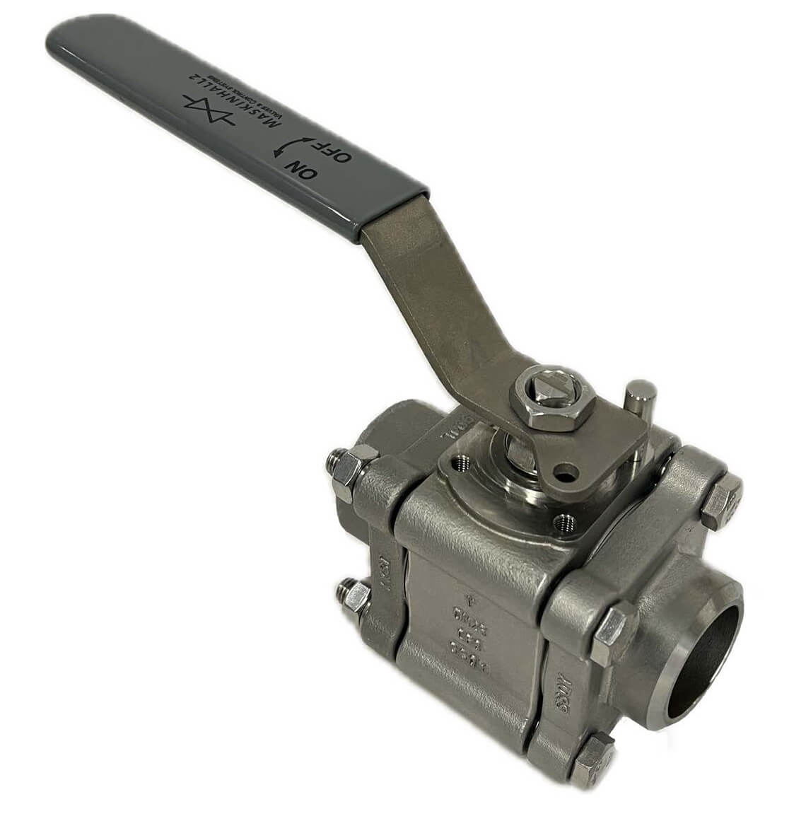 Three pieces, full bore, stainless steel body ball valve and P287 (polyimide-filled PTFE) seat. Butt welded.